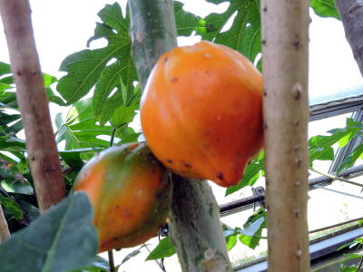 県薬草・地域作物センター温室で、パパイヤが橙色に熟した果実をつけていました。