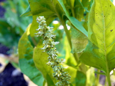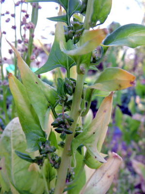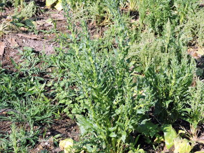 収穫を終えた野菜畑で、取り残されたホウレンンソウが花らしきものをつけているのを見かけました。