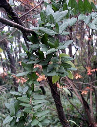 カズラの類という程度しか分からず、花も果実もないので、手がかりがありませんでしたが、県林業総合センターによると、スイカズラではないかということでした。