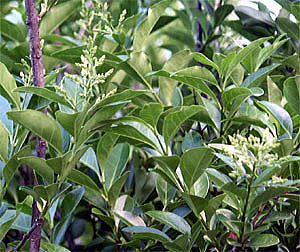 6番ティーグランド後方に、シマトネリコに囲まれるようにして一本だけ植えられていました。 コース内では、初めて見た木でした。名前が分かりませんでしたので、撮影し、その後、オオバイボタと分かりました。 図鑑によると、海岸近くに生え、また生垣として栽植される半落葉低木だそうです。 ネズミモチと同じ属なので、果実はやや似たところがあります。 花期(初夏)に、花の写真も撮りました。 実際の花は、写真のような円錐花序で、ほとんど色がなく、地味でした。 果実は、冬に紫黒色に熟すはずです。 同科同属のイボタノキも、別ページに掲載してあります。