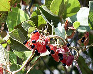 花は、初夏から初秋。豆果は長さ2cm位。豆果(鞘)は赤く熟し,開裂すると黒色の種子(マメ)が見える。