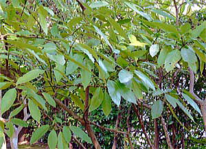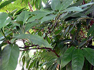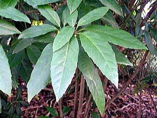 葉は対生し、長さ10〜15cm,厚くて光沢が強く,乾くと黒くなる。