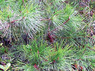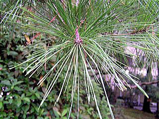 県内では、公園などにあまり植えられていないマツですので、県庁庭園のタギョウショウは、貴重な標本といえます。 写真のように、幹が根元近くから株立ち状に多出し、葉も細長く、2本が束生しています(3段目左・右の写真)。