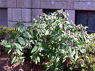 県庁本館西側の植え込みの間に、野草のヨウシュヤマゴボウが赤紫の色の果穂をつけていました。