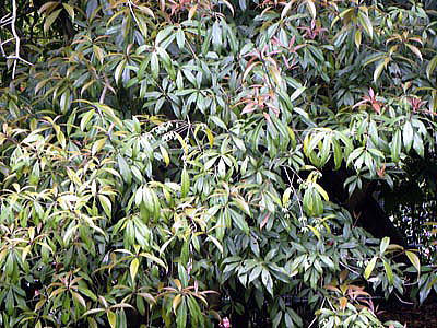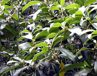 中国原産。主として西日本の庭園に栽植される常緑小高木。