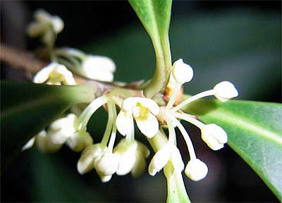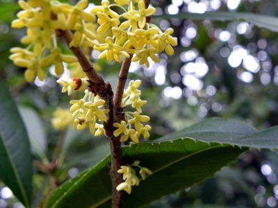 花は秋,白黄色の両性花または雌花を葉えきに散形状に束生,キンモクセイより香りが少ない。